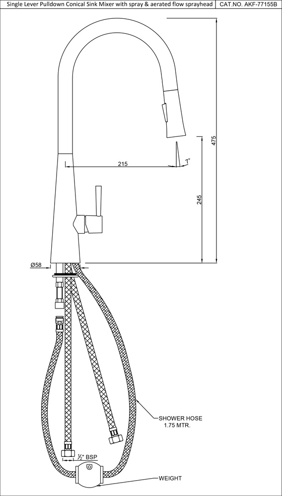 FLO2 Single Lever Pulldown Conical Sink Mixer with spray & aerated flow sprayhead with 1.75M long tube & 375mm long braided hoses