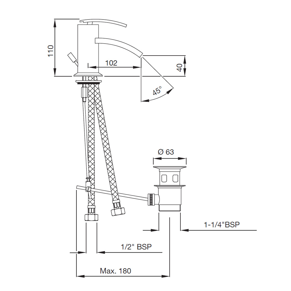 Single Lever Bidet Mixer with Popup Waste & 375mm Long Braided Hoses