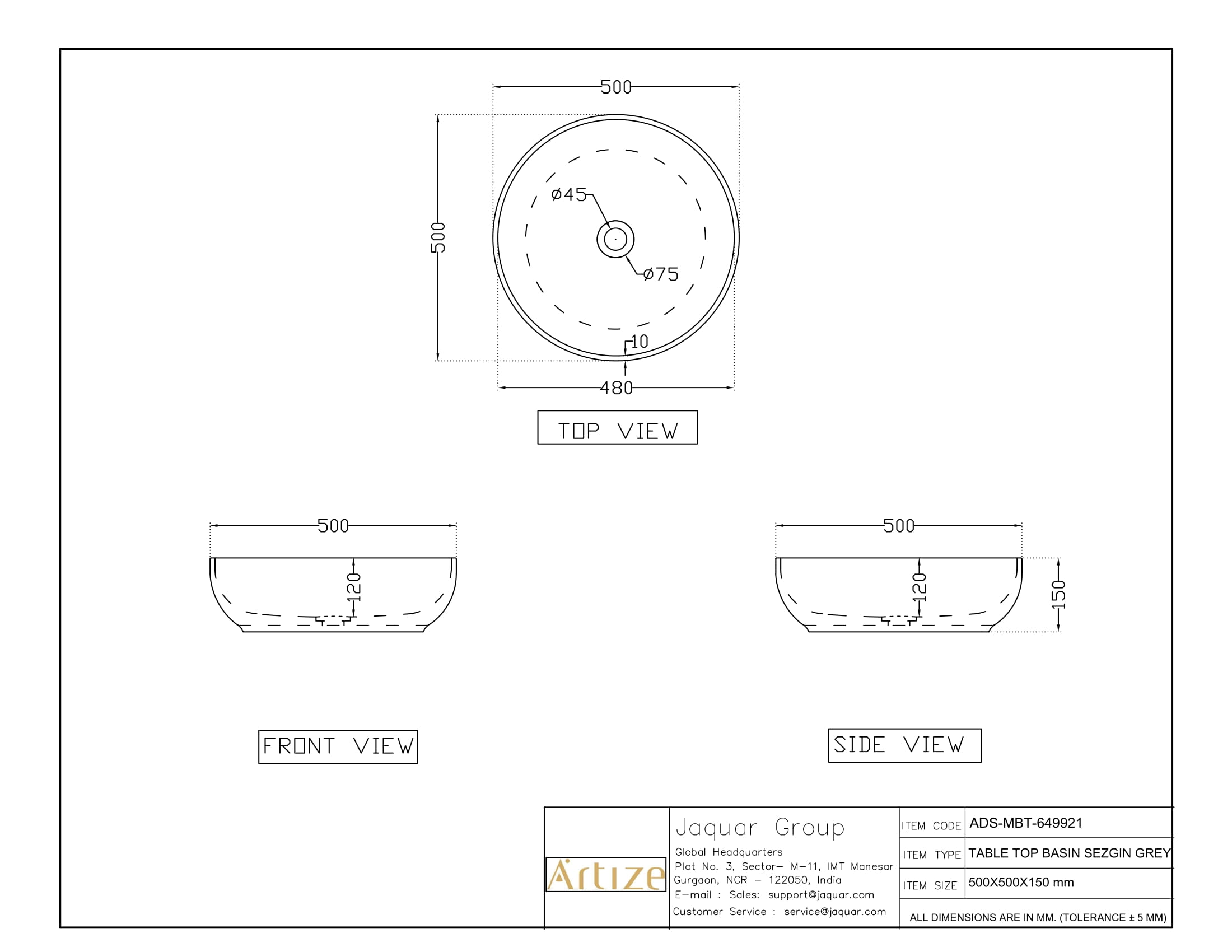 Table Top Basin - Sezgin Grey With Natural Veins, Size: 500X500X150 mm, Shape - Round